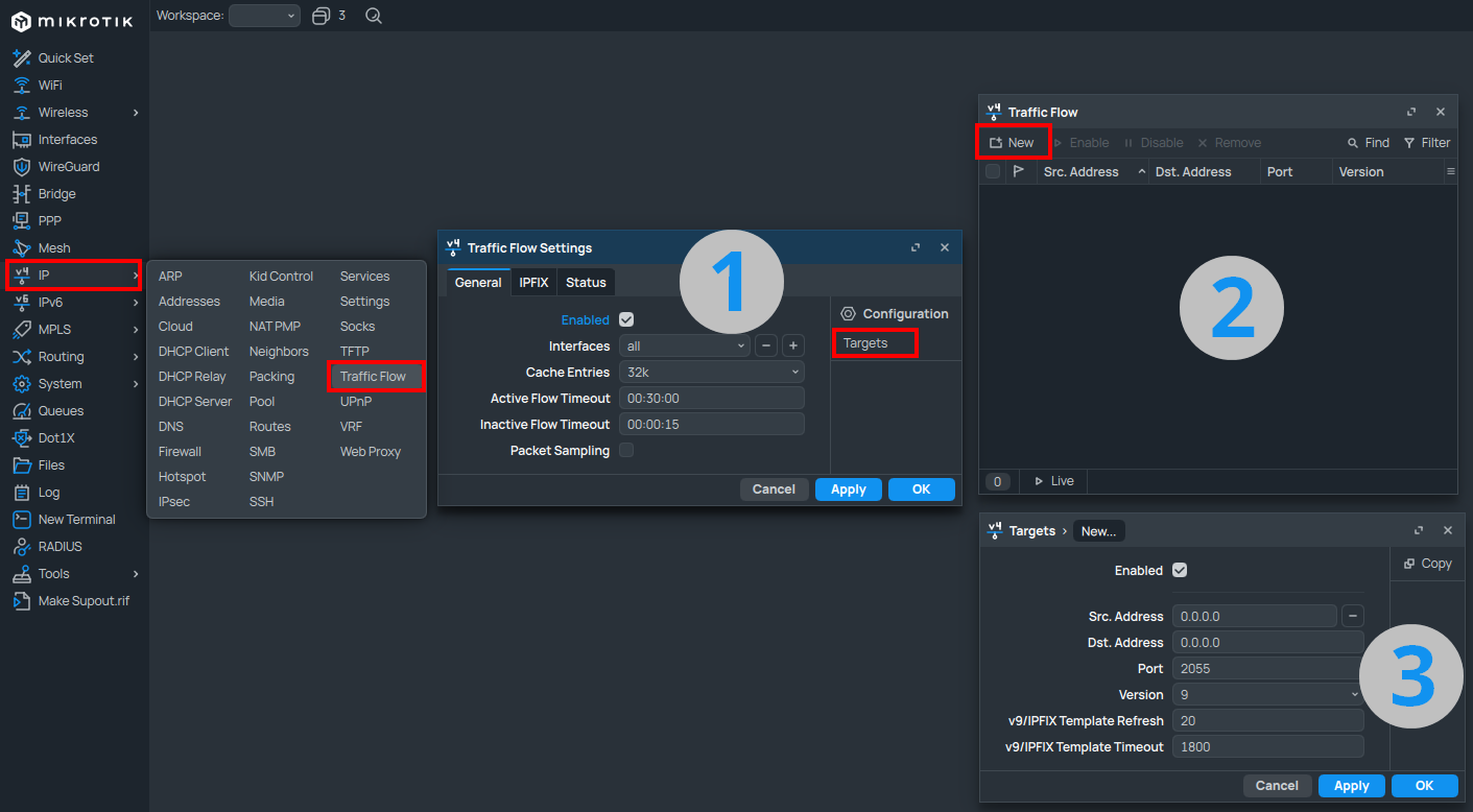 /ip traffic-flow target add dst-address=192.168.0.2 src-address=192.168.0.1 version=9 port=2055