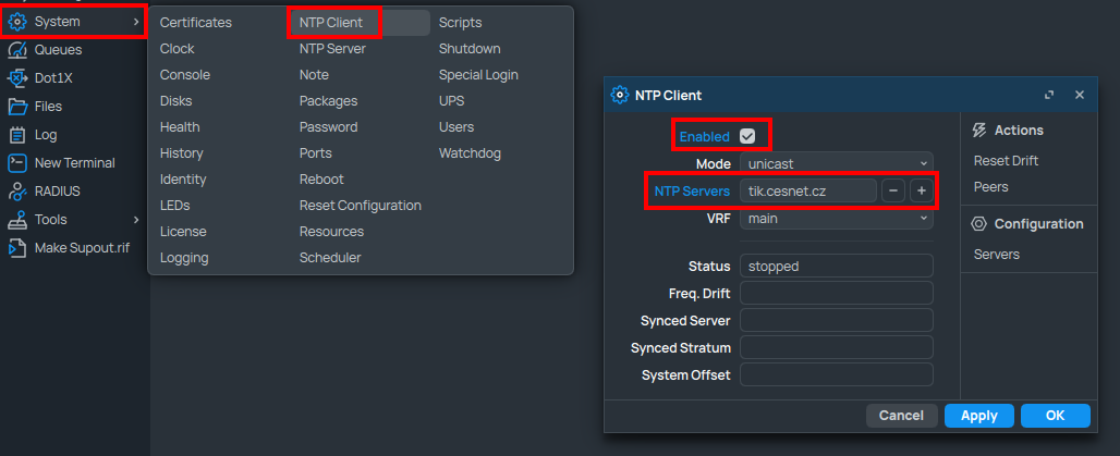 V nástroji WinBox je možné nastavit server pro synchronizaci času v (System / NTP Client). Důležité je funkci NTP klienta zapnout – Enabled.