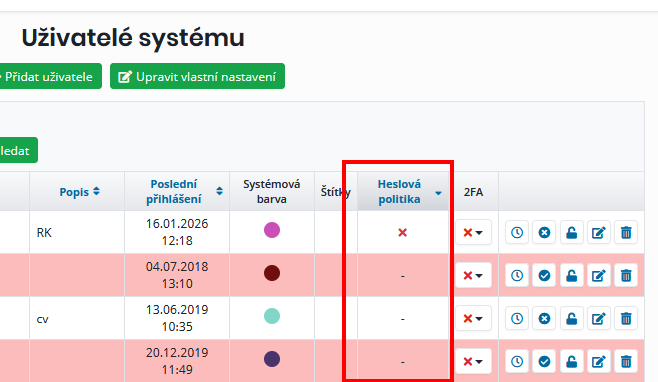 Stav hesla (jestli heslo uživatele vyhovuje nastaveným zásadám či nikoliv) je vidět v přehledu uživatelů systému (Nastavení –> Administrátoři –> Administrátoři) ve sloupci Heslová politika. Stav plnění se změní po přihlášení uživatele.