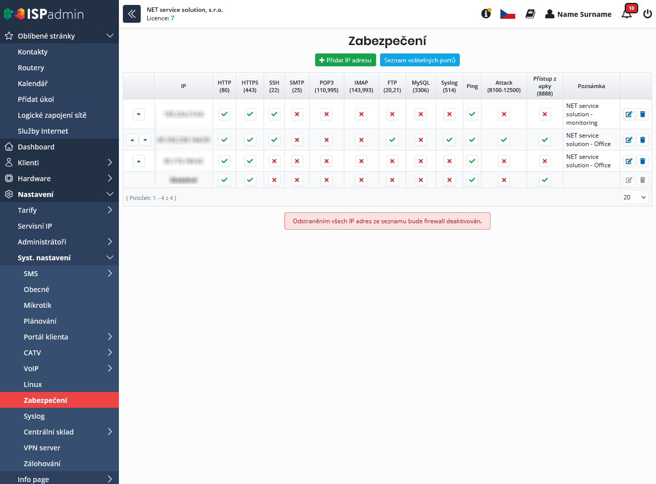 Pokud je kdekoliv umístěné/přidané pravidlo s localhost IP – 127.0.0.1, tak se na serveru s ISPA deaktivuje firewall (FW na jiném zařízení). Při deaktivaci firewallu se provede vymazání všech FW pravidel na serveru.