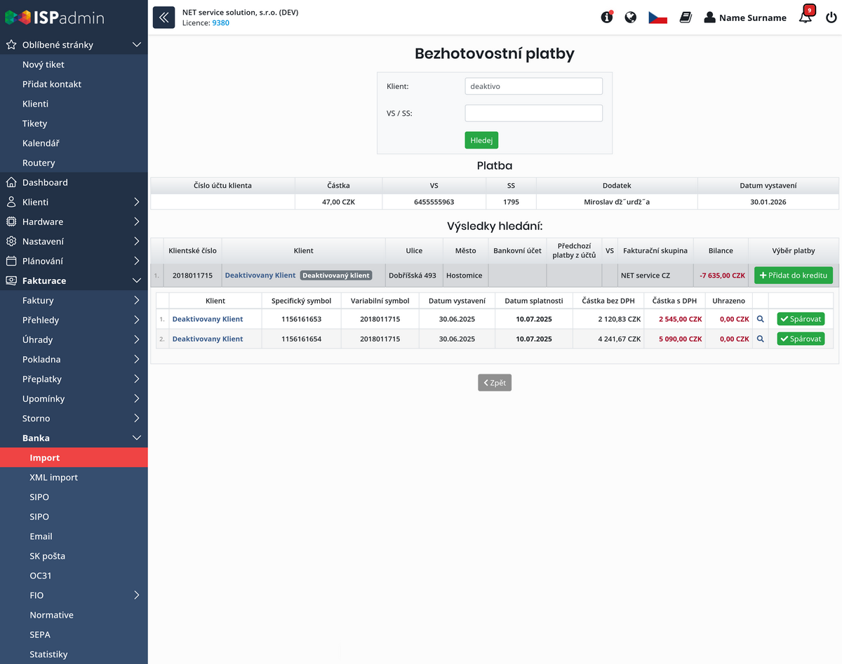 Systém byl rozšířen o možnost manuálního spárování platby i k deaktivovaným klientům. Tito jsou označeni/zvýrazněni odpovídajícím označením.