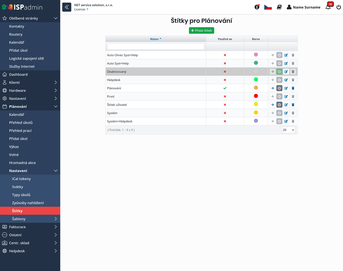 Přehled nastavených štítků v systému včetně těch použitelných v plánování