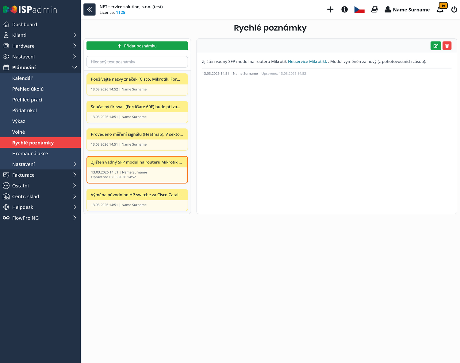 Do systému je možné přidat rychlou poznámku pomocí rychlého přístupu ze záhlaví tlačítkem (