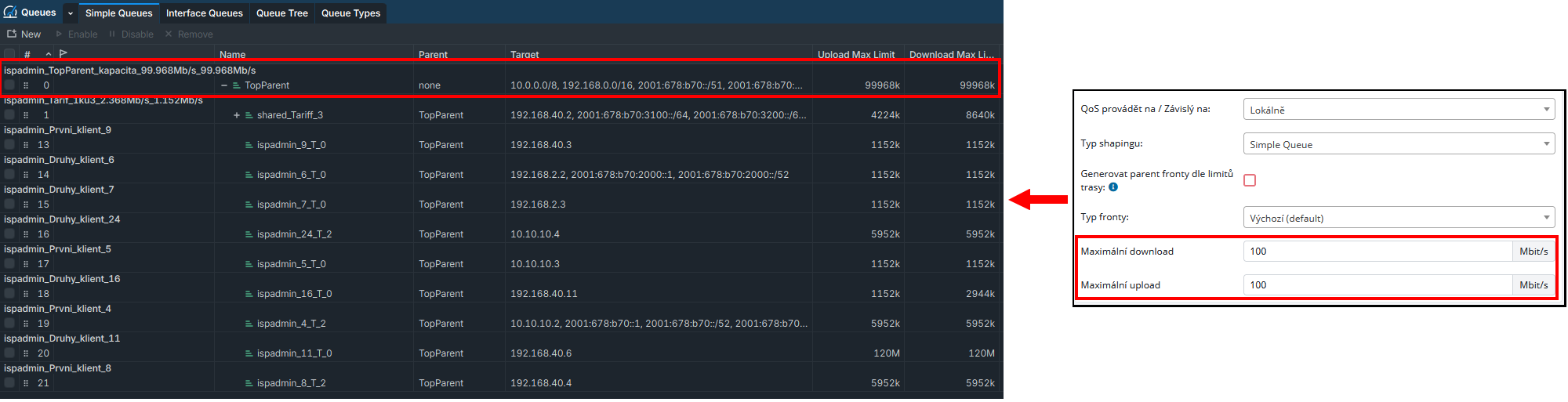 Při zvolení routeru nebo přípojného bodu u služby internet (s nastavenými max. rychlostmi download/upload), dojde k propsání limitních parametrů (max-limit) a tím vytvoření nadřazených front (parent) na routeru MikroTik, který provádí a je nastaven pro QoS.